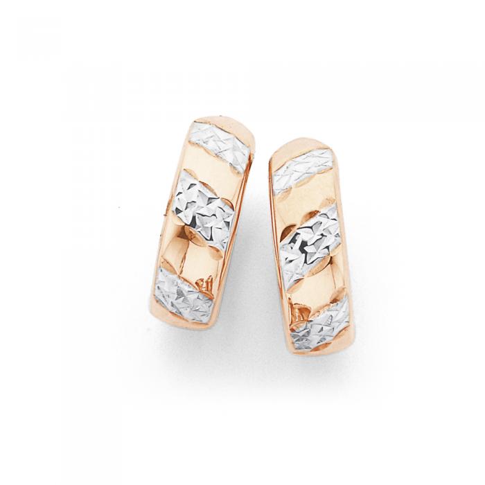 European Made 9ct Rose Gold Two Tone Diamond-cut Diagonal Stripes Huggie Earrings - Approximate Dimensions 5mm Width x 12mm Inner Diameter.