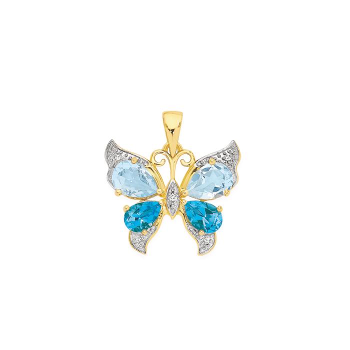 9ct Gold Multi Topaz & Diamond Butterfly Pendant