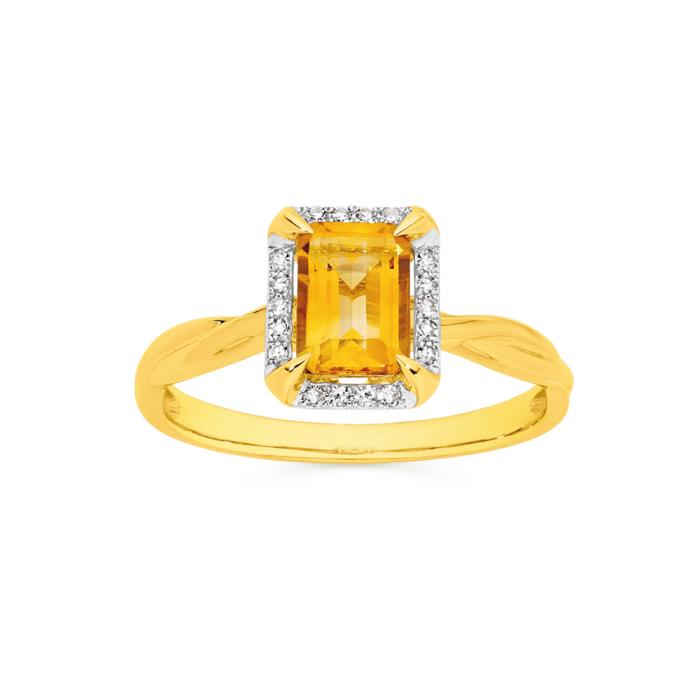 9ct Gold Citrine & Diamond Emerald Cut Framed Ring Total Diamond Weight =.07ct Citrine = 7x5mm