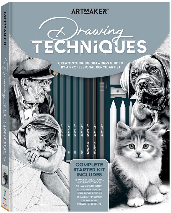 Includes 10x graphite pencils, 2x charcoal pencils, 3x torillions, 1x eraser, fineliner, sharpener and 48x pages of sketchbook.