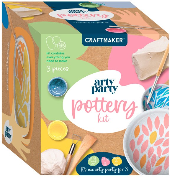 Includes 3x 350gm clay, 3x sponges, 3x paint brushes, 5x wooden tools, 6x 20ml paints and 2x 30ml glaze.