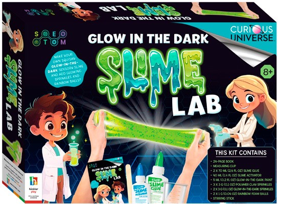 Includes 1x slime glue, slime activator, glow-inthe- dark paint, polymer clay sprinkles, glow-in-the-dark sprinkles, measuring cup, stirring stick, 2x 1g rainbow foam balls and 24x page book.