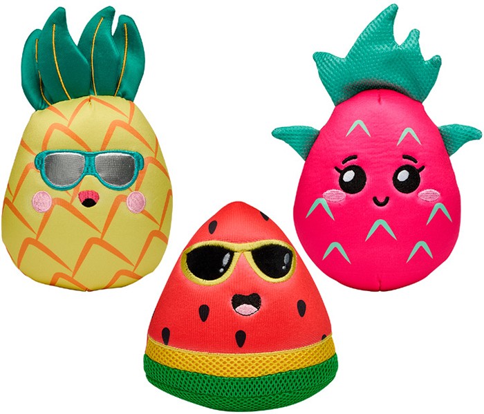 Floats on water. Durable materials with squeaker. Available in pineapple, watermelon or dragon fruit.