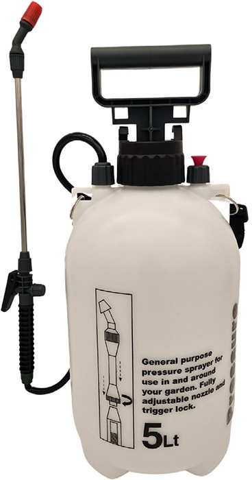 Pump-action pressure sprayer. Adjustable spray pattern. Safety pressure release valve and trigger lock. 1.3m hose.