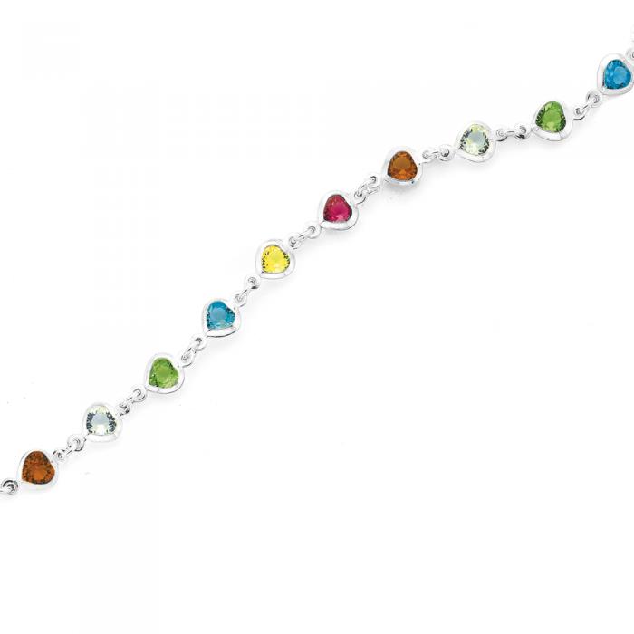Sterling Silver 17cm Linked Multi-Coloured Crystral Heart Charms Bracelet