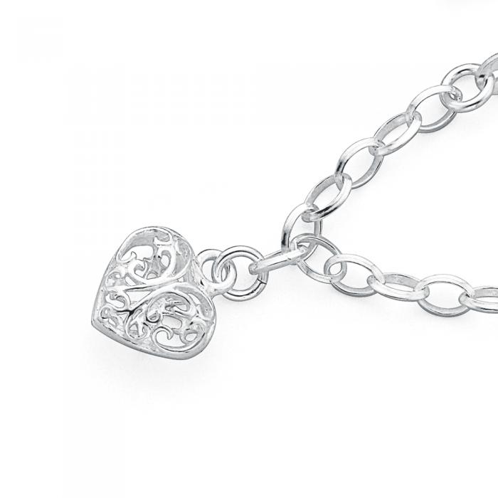 Sterling Silver Filigree Heart Charm 19cm Oval Belcher Bracelet