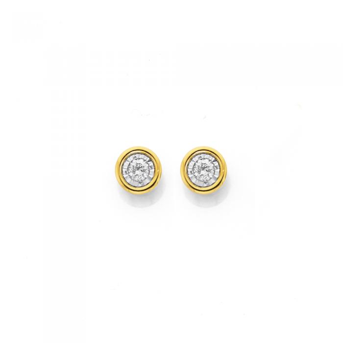 9ct Gold Diamond Round Brilliant Cut Miracle Bezel Set Stud Earrings Total Diamond Weight =.10ct. Size = Approx. 4mm in Diameter