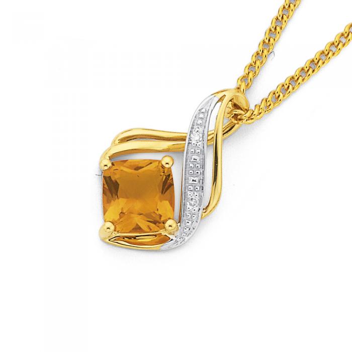 9ct Gold Citrine & Diamond Cushion Double Swirl Pendant