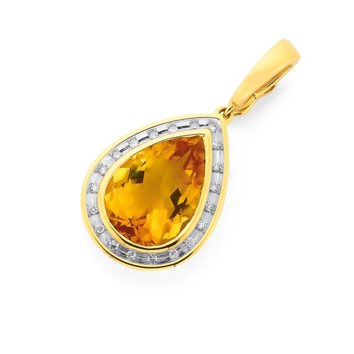 9ct Gold Pear Cut Citrine Enhancer Pendant Framed with 10 Points of Diamonds