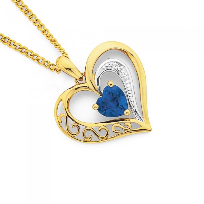 9ct Gold, Created Sapphire & Diamond Filigree Open Heart Pendant
