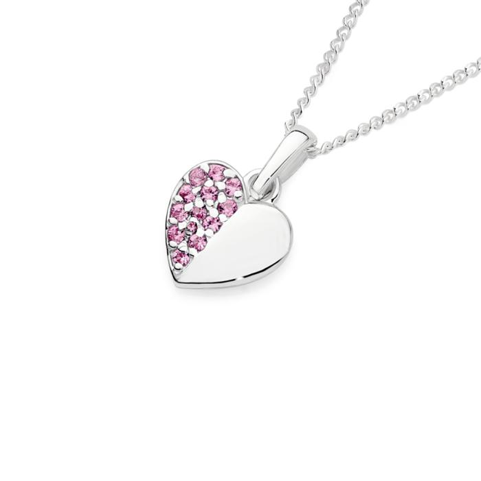 Sterling Silver Half Cubic Zirconia Pink Pave Heart Pendant. Approximate Dimensions - 10mm Width x 15mm Height including bale. Complete the look with the matching earrings (1531065).