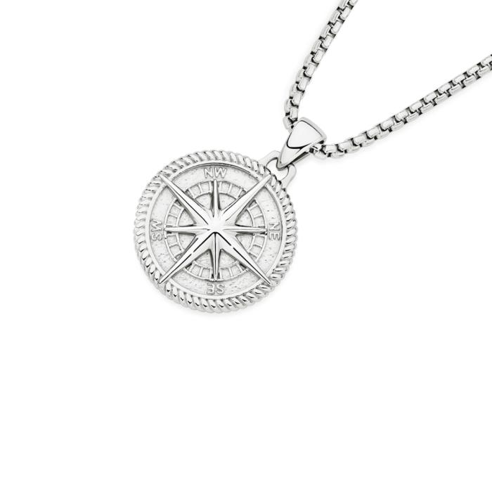 Stainless Steel Round Compass Pendant. Approximate Dimensions: 22x22mm Diameter. This pendant comes with a Stainless Steel 55cm Rounded Box Chain.