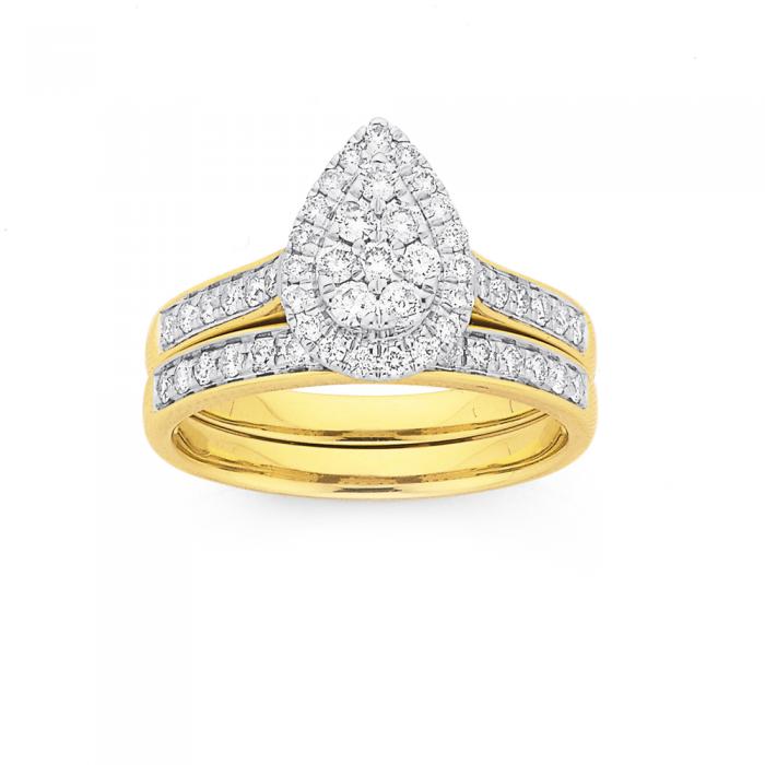 9ct Gold Diamond Round Brilliant Cut Cluster Pear Shape Shoulder Bridal Set Total Diamond Weight =.70ct