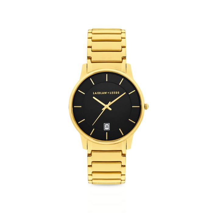This minimalistic watch offers a clear and calm approach to time-keeping. Featuring a gold tone stainless steel case and bracelet, with a classic black dial.