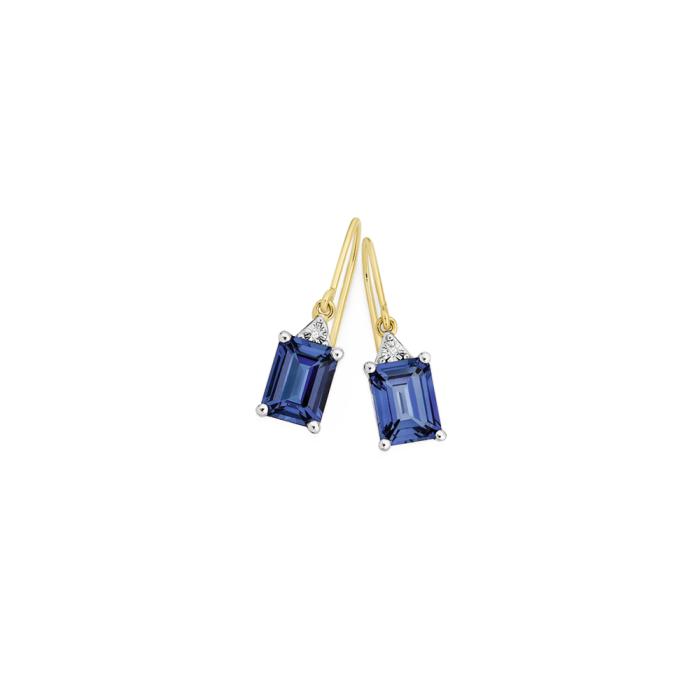 9ct Gold Created Ceylon Sapphire & Diamond Emeral Cut Hook Earrings Created Ceylon Sapphire = 8x6mm