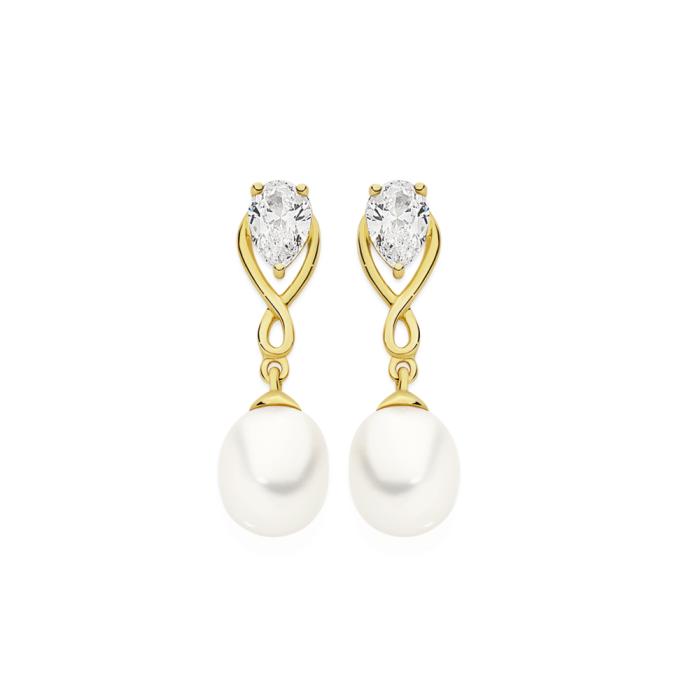 9ct gold cultured freshwater pearl & cubic zirconia infinity drop stud earrings