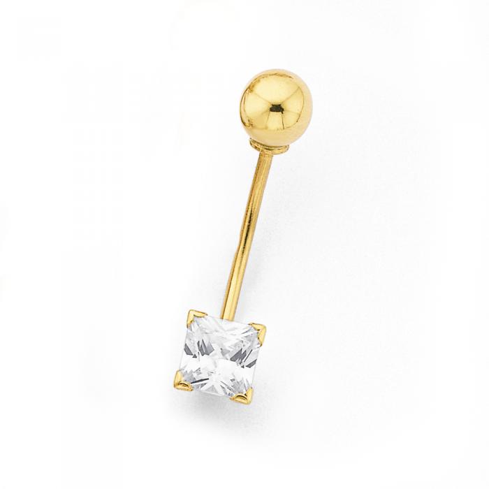 9ct Gold Claw-set Princess-cut Cubic Zirconia Belly Bar. Approximate Dimensions - Ball-end Diameter: 5mm, Shaft Gauge (Thickness): 1mm, Shaft Length: 16mm