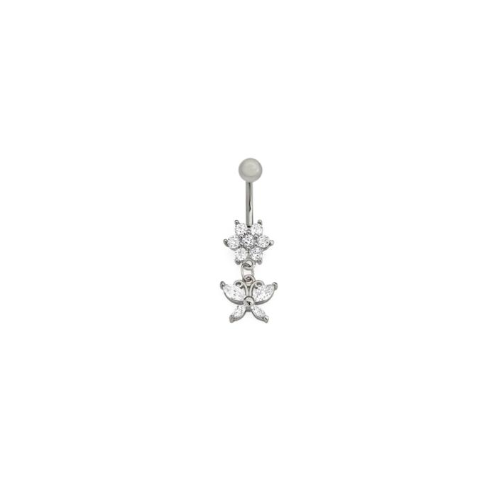 Sterling Silver & Steel Cubic Zirconia Butterfly on Flower Belly Bar