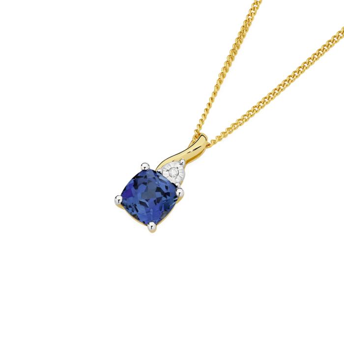 9ct Gold Created Ceylon Sapphire & Diamond Pendant