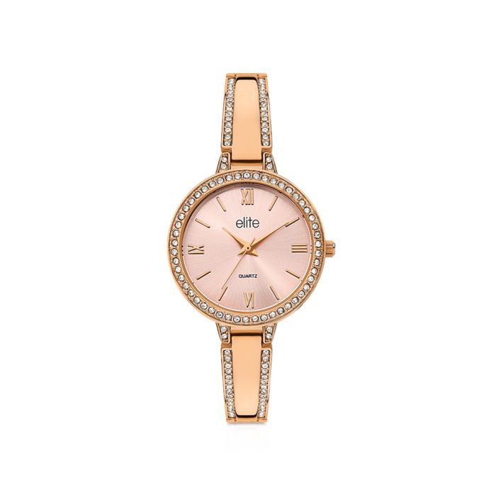 The Penny Watch is a timeless piece crafted for understated glamour. Featuring a gleaming rose gold-tone case encircled by shimmering crystals, this watch captures light with every movement. The clean rose gold dial, adorned with Roman numeral and stick markers, adds a touch of classic charm. Finished with a slim bracelet embellished with crystal accents, its the perfect balance of femininity and sophistication. Whether worn daily or for special occasions, Penny adds polished shine to every look.