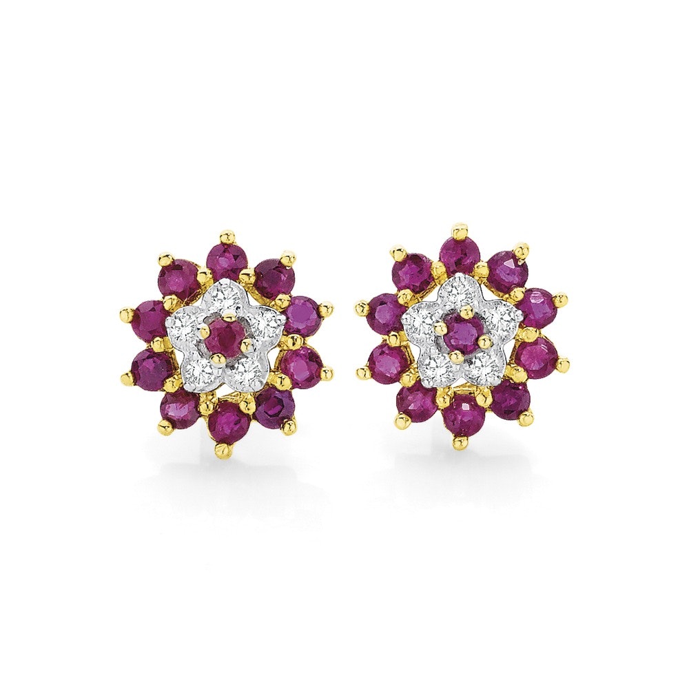 9ct Gold Natural Ruby and Diamond Flower Stud Earrings