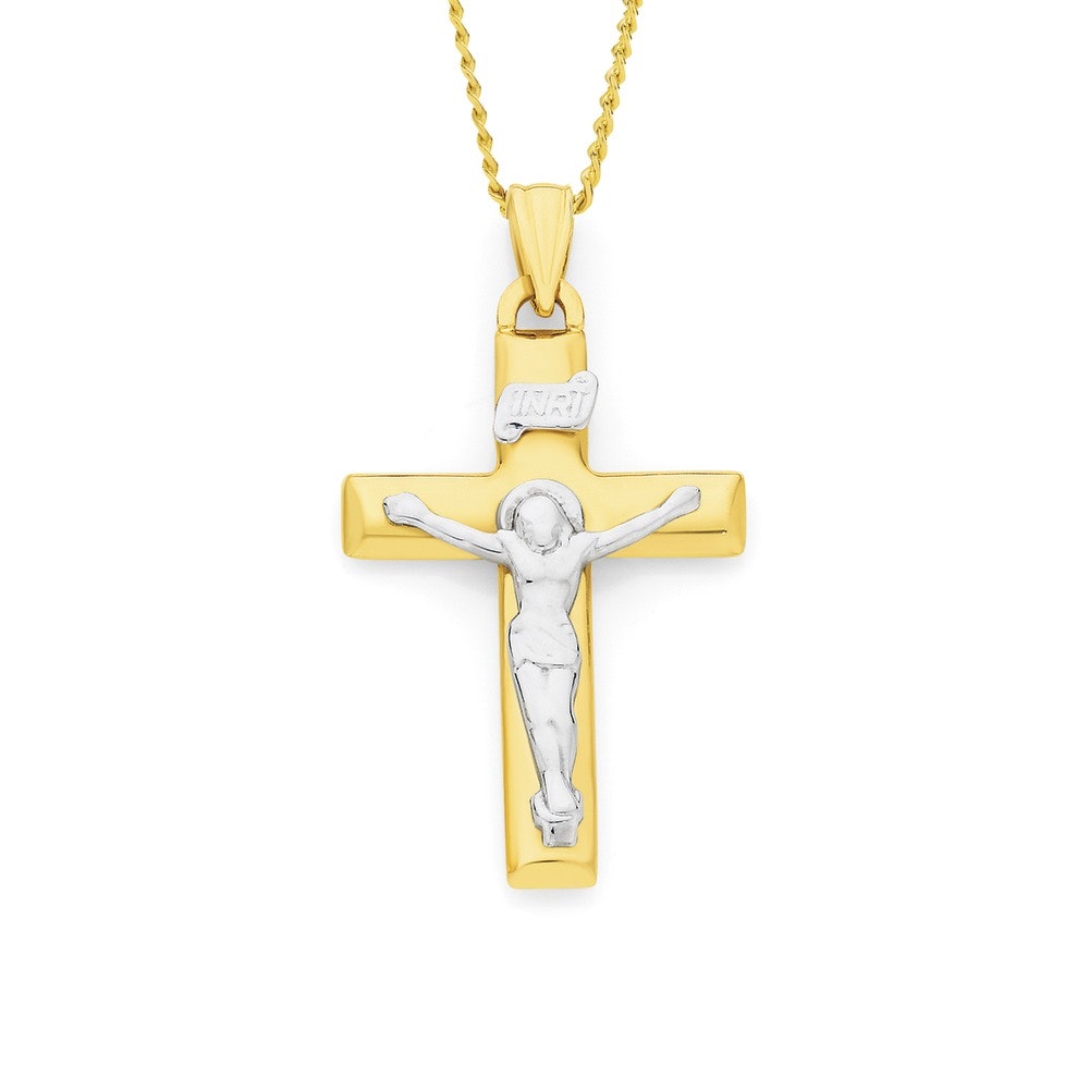 European Made 9ct Gold Two Tone Hollow Crucifix Pendant - Approximate Dimensions 21mm x 40mm including Bale