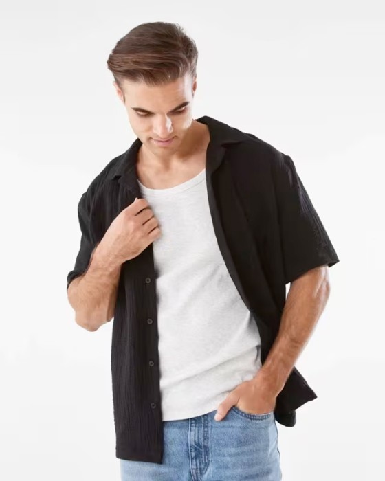 Sizes: XS-4XL.• Double cloth textured fabric• Relaxed fit and open collar