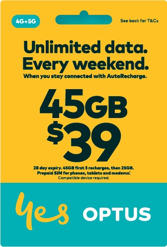 Unlimited Data Weekends: from 12.01am Sat to 11.59pm Sun (local time) when you activate/recharge with AutoRecharge on $39 Optus Flex Plus (excl. expired or manual recharges). Not accessible on modems.