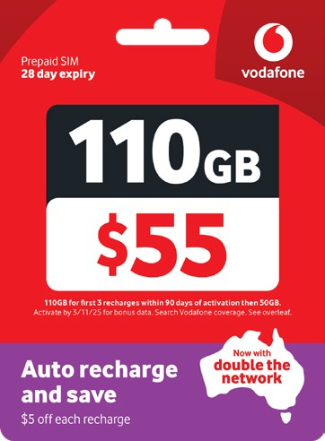 Vodafone Prepaid SIM: Data for use in AU. Limit 2 per eligible customer. Price offers end 14/10/25. Activate by 03/11/25 for bonus data offer.