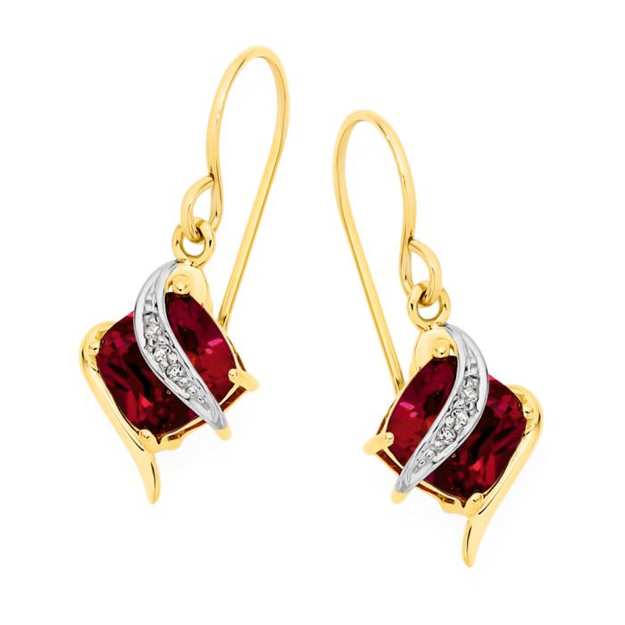 9ct Gold Created Ruby & Diamond Cushion Crossover Drop Earrings