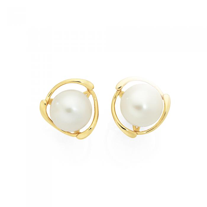 9ct Gold 8mm Cultured Freshwater Button Pearl Halo Swirl Stud Earrings