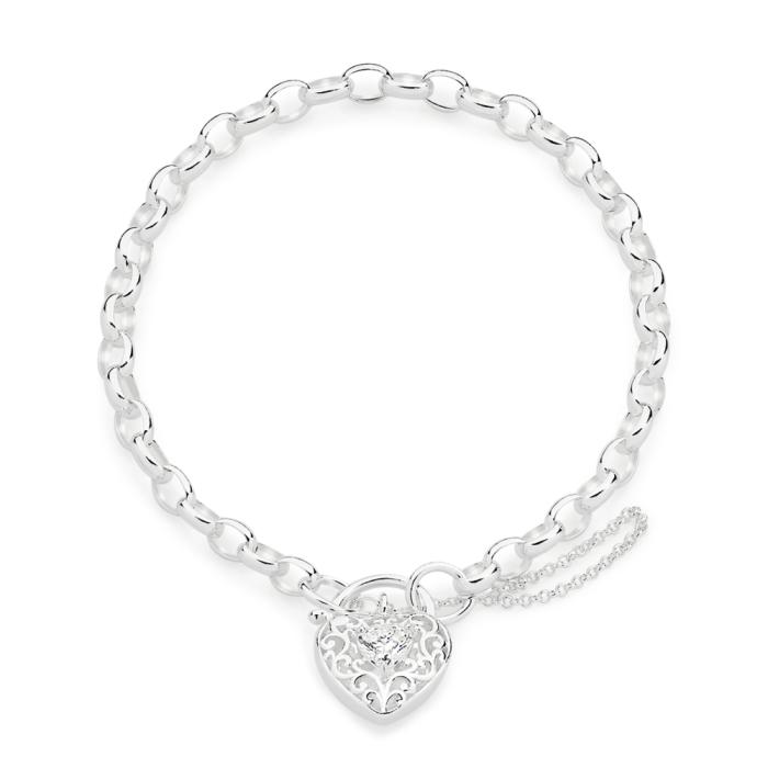 Sterling Silver CZ 19cm Heart Filigree Padlock Bracelet