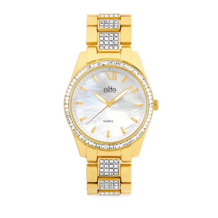 Bold, luminous, and unapologetically luxe Mia is the ultimate statement watch for the woman who commands attention. Featuring a radiant gold-tone body, shimmering crystal-inlaid bracelet links, and a mother-of-pearl dial, this timepiece effortlessly combines opulence with sophistication. Its bezel sparkles with pav?-set crystals, while the dials Roman numeral and stick hour markers offer a classic balance to its modern glamour. Whether you're dressing up for an evening out or adding polish to your everyday look, Celeste is your signature accessory.