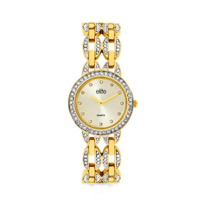 Introducing Zara a masterpiece of golden elegance and sparkling charm. Designed for the woman who isn't afraid to shine, Zara features a refined circular case, a crystal-encrusted bezel, and an intricate dual-link bracelet with dazzling crystal accents throughout.