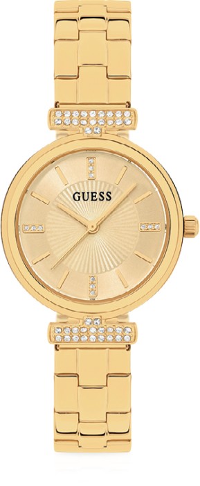 Turning timepieces into stunning works of art. An array of crystal details surround the 28mm gold tone case of this elegant gold tone bracelet watch from GUESS.