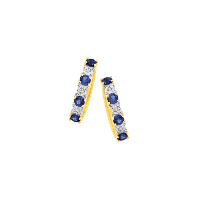 9ct Gold Created Ceylon Sapphire & Diamond Round Brilliant Cut Alternating Claw Set Huggie Earrings