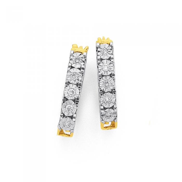 9ct Gold Diamond Claw Set Hoop Earrings. External Size = Approx. 14mm x 3mm.