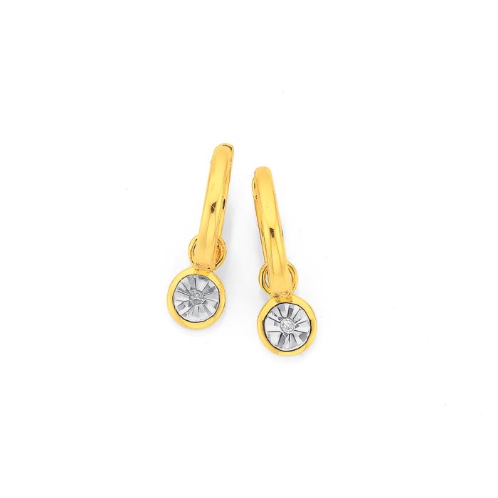 9ct Two Tone Gold Diamond Huggie Earrings with Miracle Bezel Set Drops. External Size = 14mm x 4mm Including Drop (Drop Size = 4mm in Diameter).