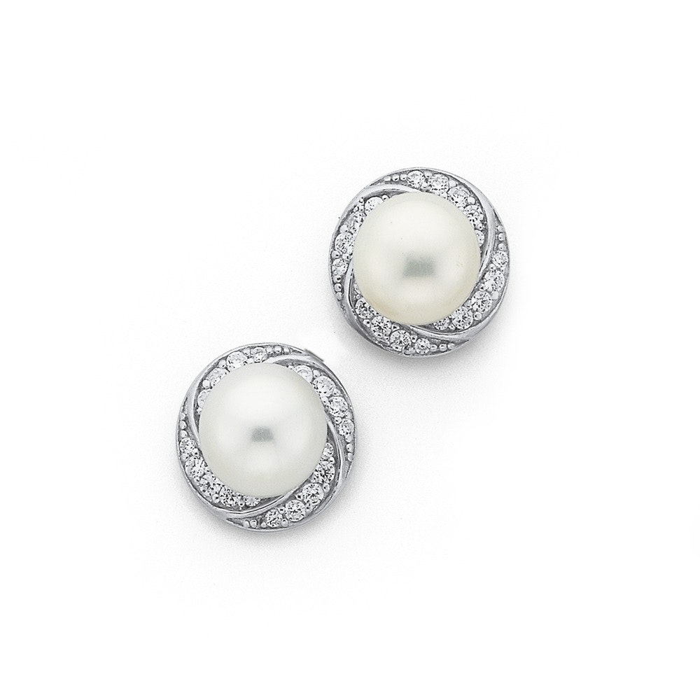 Sterling Silver Cultured Freshwater Pearl & CZ Twist Stud Earrings