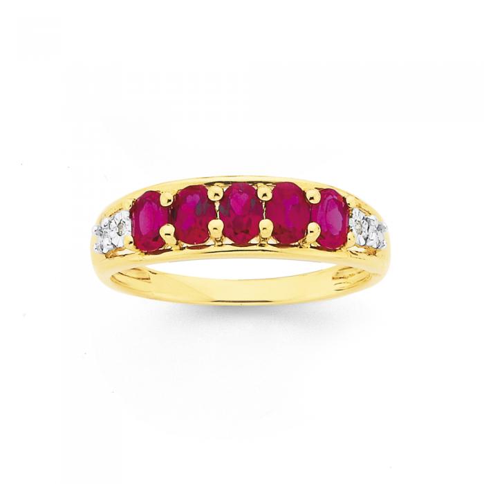 9ct Gold Ring featuring five Oval Cut Created Rubies with diamonds.7351164