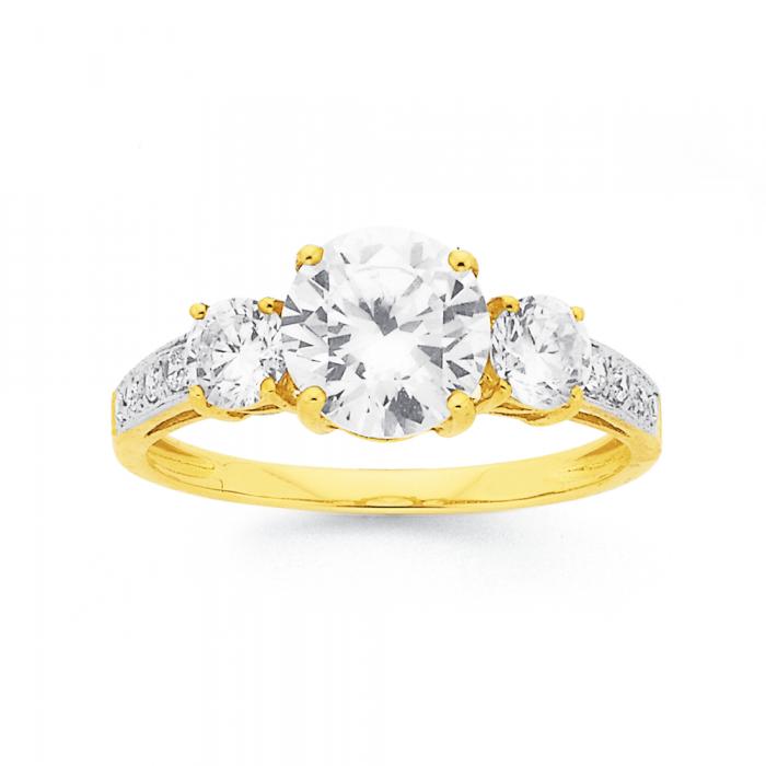 9ct Gold Cubic Zirconia Round Brilliant Trilogy Shoulder Dress Ring