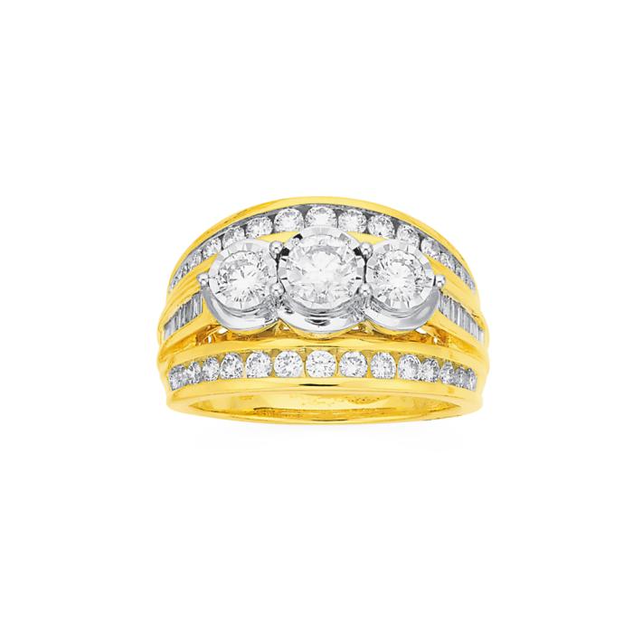 9ct Gold Diamond Round Brilliant Cut & Baguette Cut Trilogy Three Row Wide Band Total Diamond Weight = 1.50ct