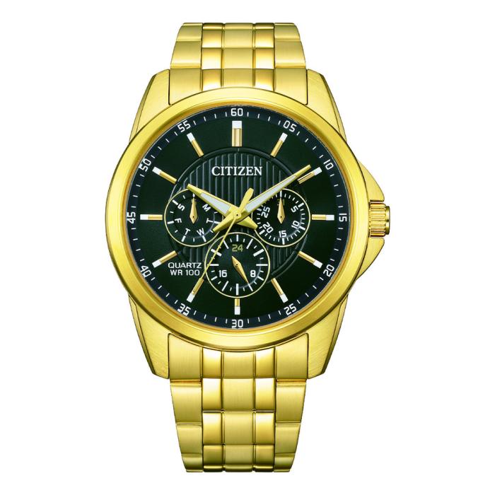 With a bold, masculine design, this Quartz watch exudes confidence and sophistication. Blending striking aesthetics, durability, and versatility, its the perfect companion for both the office and casual outings with friends. Expertly crafted from stainless steel and rated WR100, its built to withstand daily challenges, while the gold accents add a touch of elegance. The carefully designed velvet black dial, showcasing day as well as 12/24-hour time, makes this timepiece ideal for any occasion.