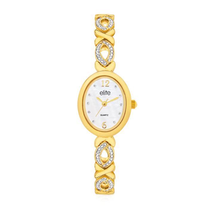 Timeless femininity meets graceful design in The Uno Watch. With its luminous mother-of-pearl dial, this elegant timepiece captures the beauty of delicate iridescence, enhanced by sparkling crystal markers and gold tones. The standout feature is its intricately designed crossover bracelet a sculptural statement that adds both visual interest and luxurious charm. The oval case adds a vintage-inspired touch, making The Uno Watch the perfect accessory for those who love refined sophistication with a modern twist.