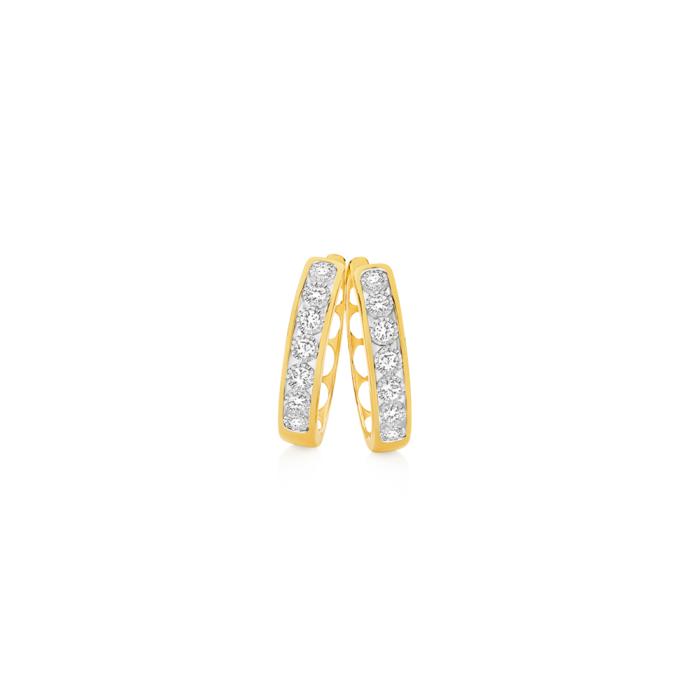 9ct Gold Diamond Round Brilliant Cut Miracle Set Huggie Earrings Total Diamond Weight = .50ct. External Size = Approx. 20mm x 4mm.