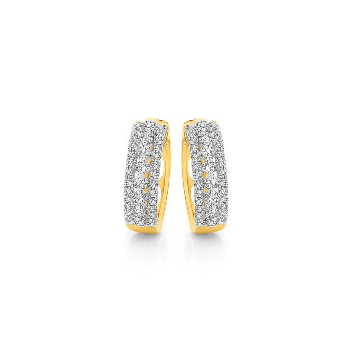 9ct Gold Diamond Round Brilliant Cut Three Row Huggie Earrings Total Diamond Weight = .34ct. External Size = Approx. 11mm x 4mm.