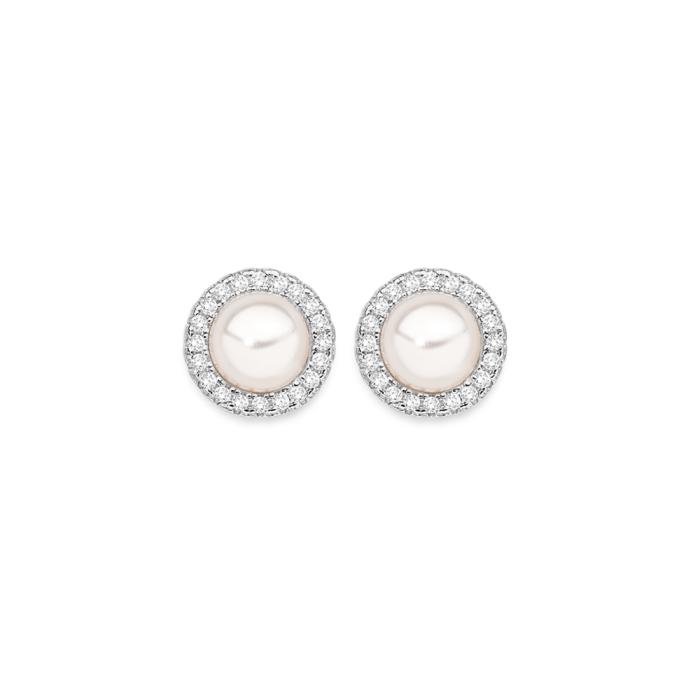 Sterling Silver 6mm Cultured Freshwater Pearl & CZ Cluster Stud Earrings