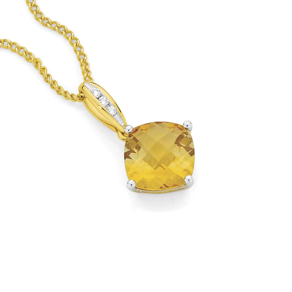 9ct Gold Citrine & Diamond Checkerboard Pendant, Citrine Stone Size = 9mm. Approximate Length (including bale) = 20mm