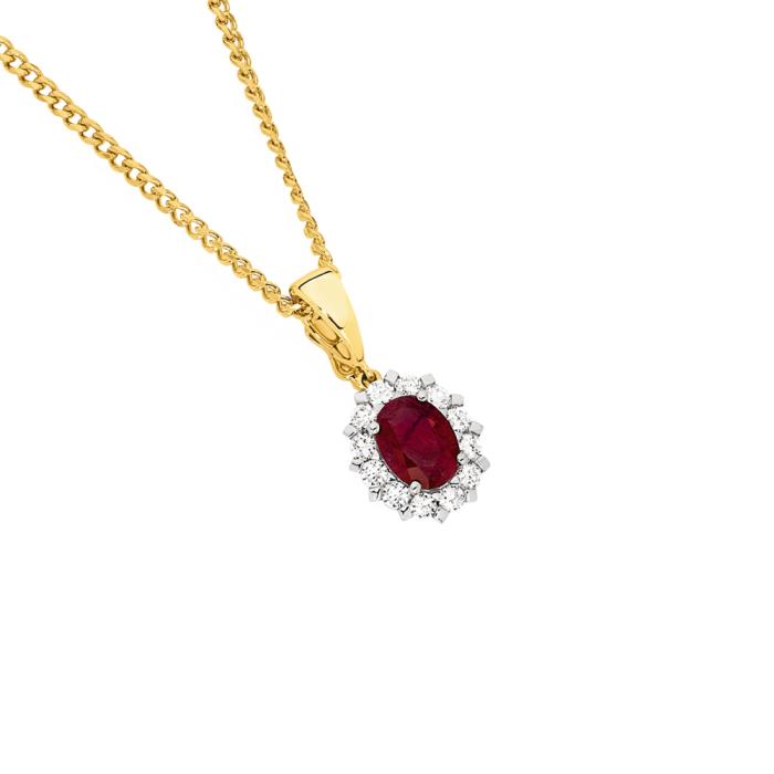9ct Gold Natural Ruby & Diamond Oval Cut Royal Framed Enhancer Pendant Total Diamond Weight =.50ct. Natural Ruby Stone Size = 8x6mm. Approximate Length (including bale) = 20mm