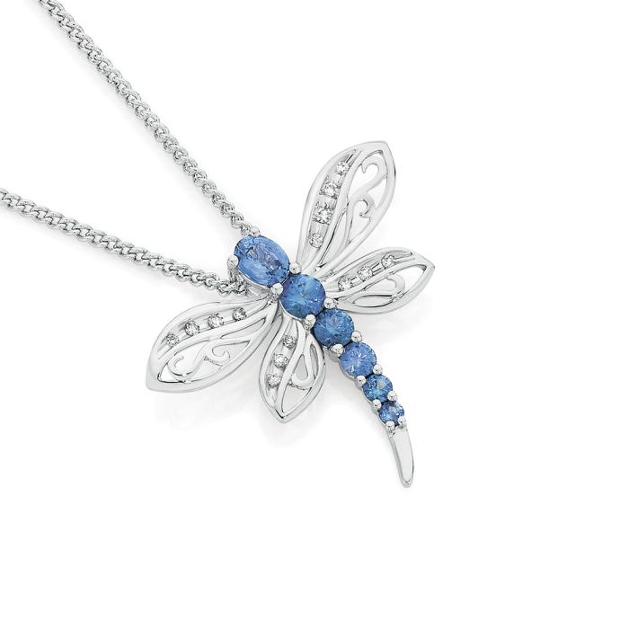 9ct White Gold Natural Ceylon Sapphire & Diamond Dragonfly Slider Pendant